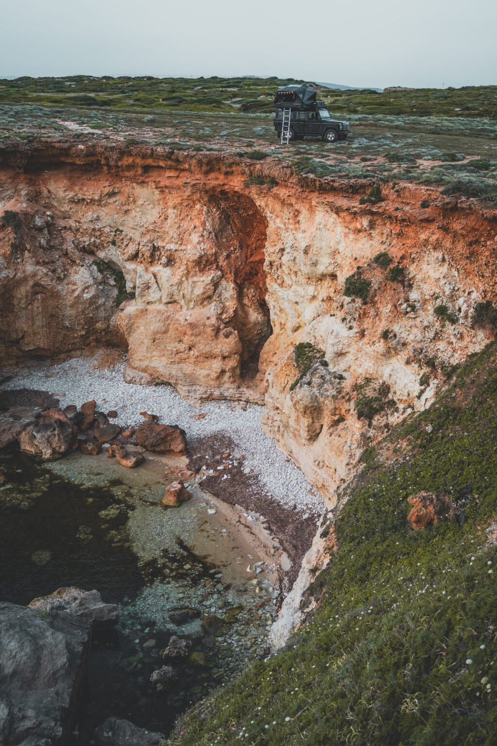 We kept seeing those expensive houses pinned high above the beaches and thought—why pay for the view when you can earn it? So we found our own cliffside throne: a flat, lunar-looking slab of rock that felt like another planet. Our Defender sat right on the edge, tiny against the raw sweep of sea and stone—by night everything turned hard-grey and quiet, like the world had been reduced to shape and shadow.