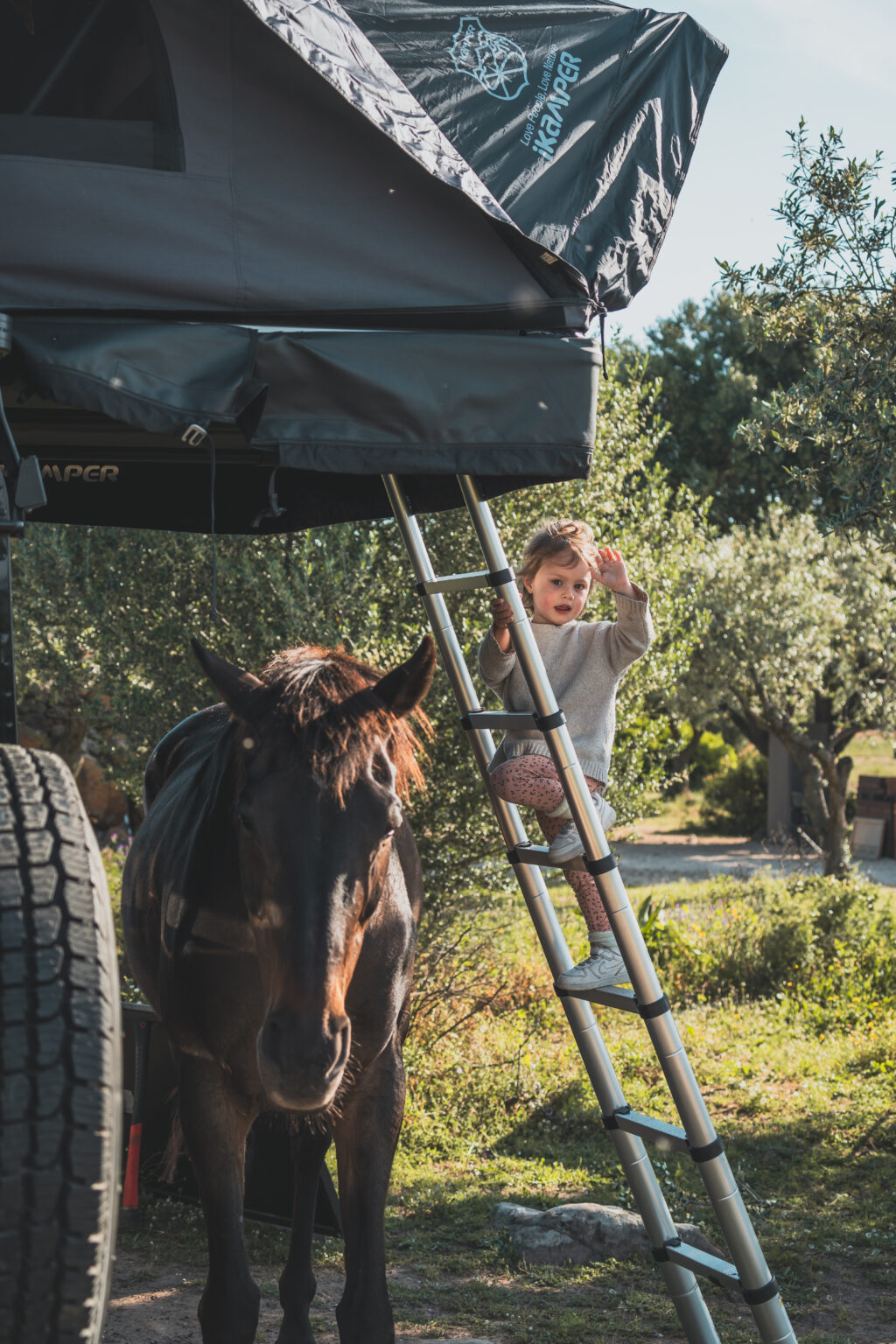 Donkeys, dogs, cats and even a gentle horse wandered around, curious as guests and more than happy to keep Lovi entertained while we cooked dinner and relaxed. It was exactly the kind of low-key, friendly spot we love — part campsite, part farm, all nature.